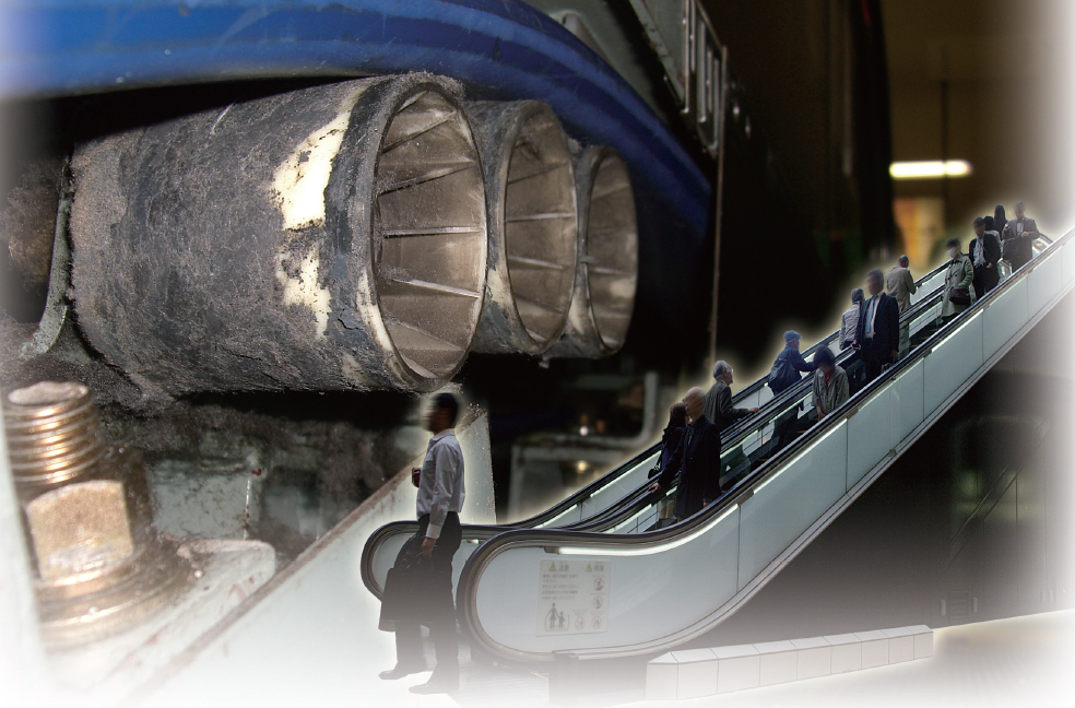 これまで日々の清掃作業に始まり、自動清掃装置、研磨&コーティング処理など、手すりベルトをキレイにするために様々な取り組みがされてきましたが、根本的な原因は、装置内部にあって普段手の届かない、手すりベルト駆動装置のローラー表面に付着・堆積した「汚れ」にあります。